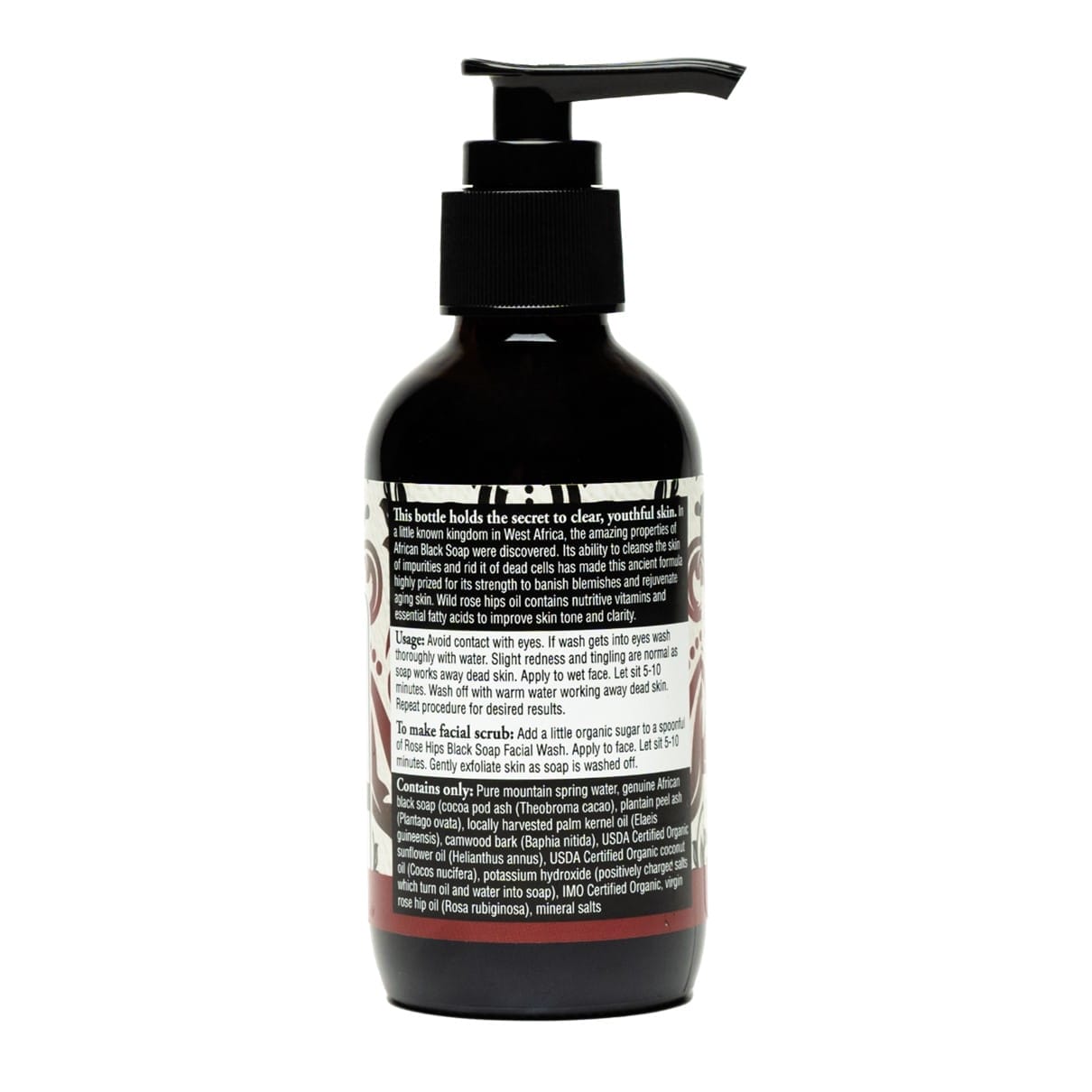Spring water, Yoruban black soap, Certified organic sunflower oil, Certified organic coconut oil, Potassium hydroxide (lye), Certified organic rose hips oil, Kalahari mineral salts.